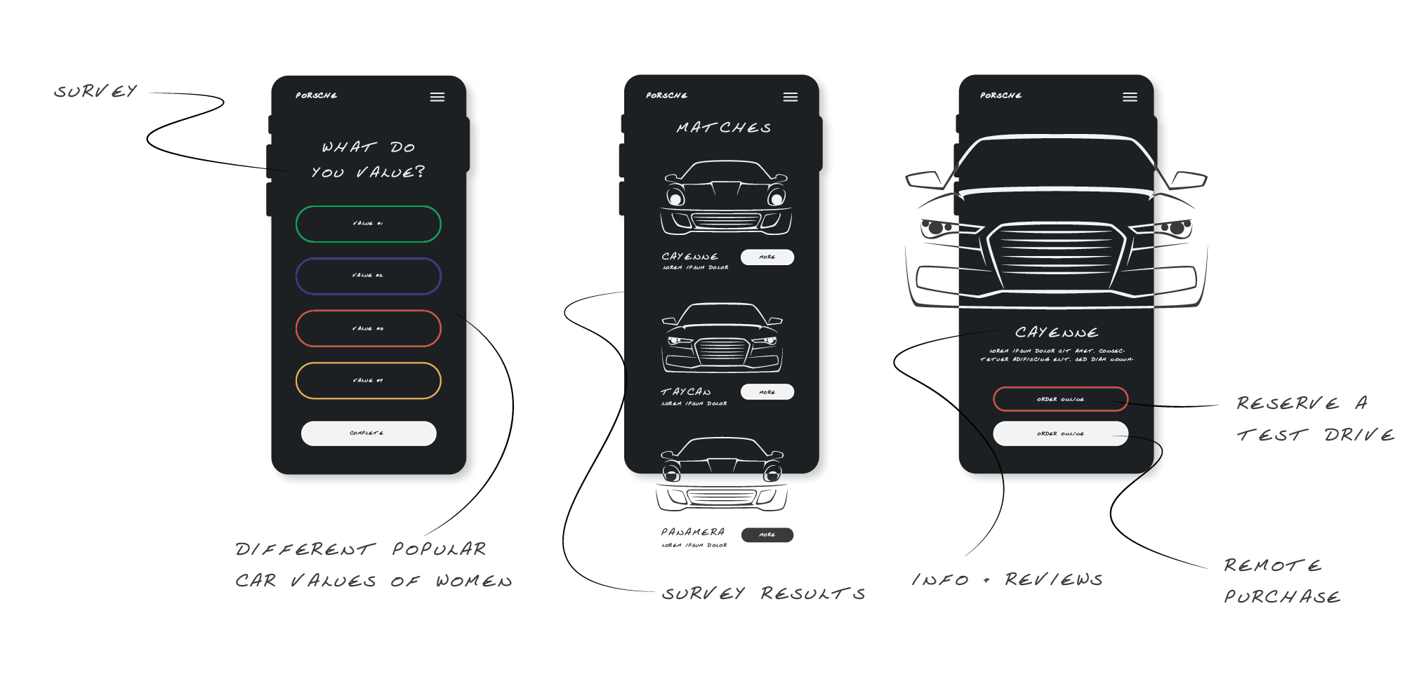 My team and I researched trends and surveyed various women to understand how Porsche can better attract the female customer. We presented our key insights directly to Porsche. I revisited our findings to design a mobile app concept that streamlines the car search process in order to better align with common values that women prioritize the most.